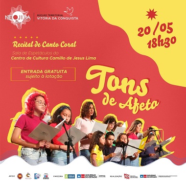 Na próxima sexta-feira, 20, às 18h30, a Sala de Espetáculos do Centro de Cultura Camillo de Jesus Lima recebe os integrantes dos coros infantil e juvenil do Núcleo Territorial NEOJIBA (NTN) Vitória da Conquista para o Recital Tons de Afeto. O evento promete emocionar o público da cidade com apresentações em homenagem ao Dia das Mães, celebrado em 8 de maio, e ao Dia da Família, comemorado no último domingo, 15.