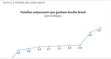 Em agosto, havia 5,3 milhões de famílias unipessoais recebendo o Auxílio Brasil, bem superior a outubro de 2021, quando ainda existia o Bolsa Família e havia 2,2 milhões de casos assim.